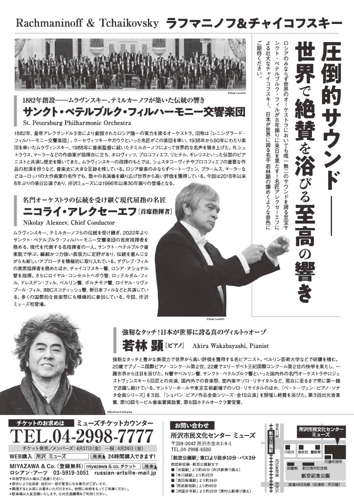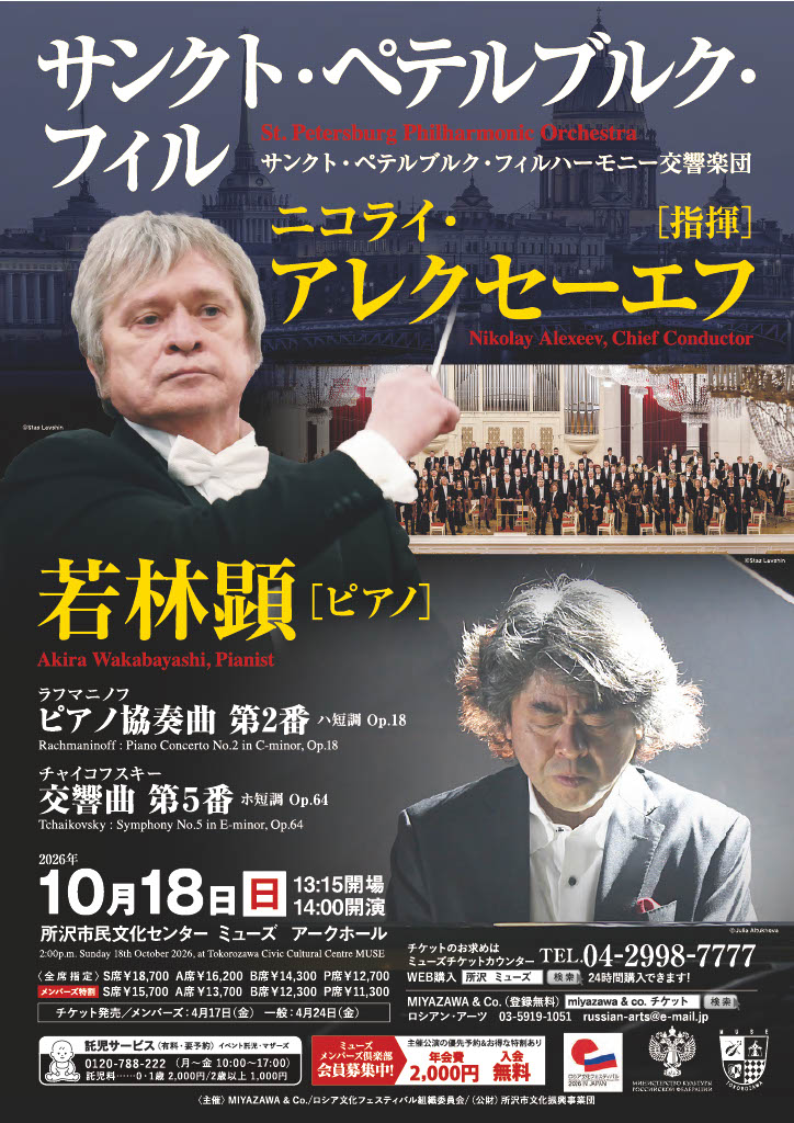 サンクト・ペテルブルク・フィルハーモニー交響楽団2026年4月28日|で Event|による wakabayashi公演名: サンクト・ペテルブルク・フィルハーモニー交響楽団 日時: 2026年10月18日(日) 14:00開演(13:15開場) 会場: 所沢市民文化センター ミューズ アークホール